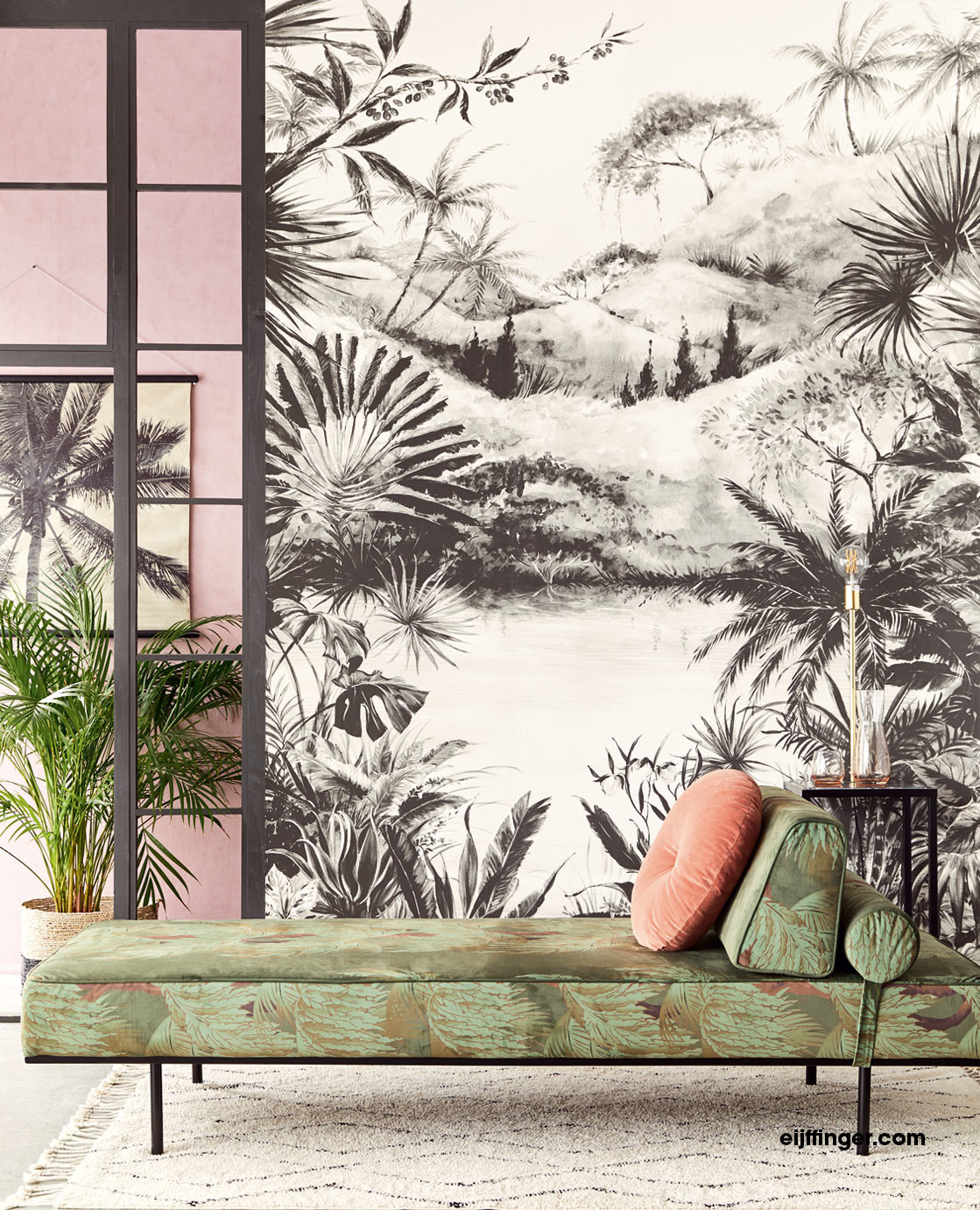 Das malerische Wandpanel Tropical Large 384604 aus der Vivid Kollektion von Eijffinger zeigt eine idyllische Tropenlandschaft und bringt Ruhe in ihr Zuhause.