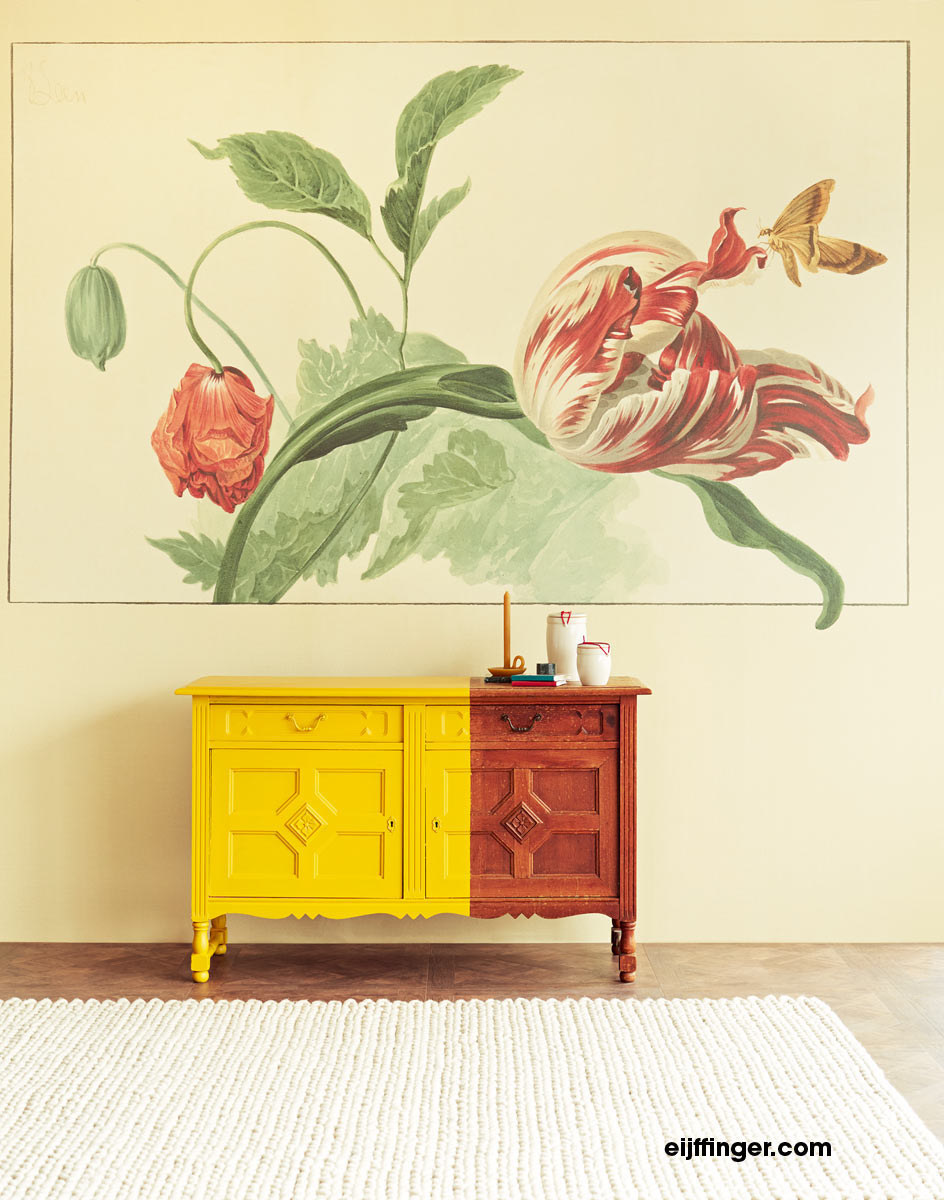 Das digital gedruckte Masterpiece Wandbild Tulip and Poppy cream 358118 von Eijffinger bringt eine ruhige Stimmung mit einem künstlerischen Hauch in Ihr Zuhause.