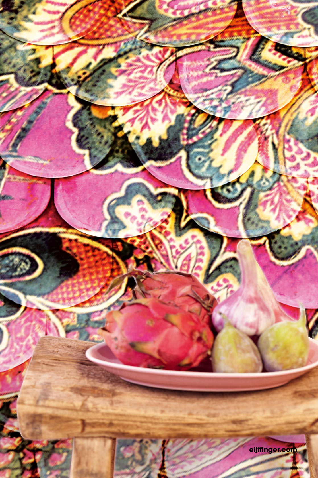Die digital gedruckte Sundari Fototapete Scallop Wall Fuchsia 375208 von Eijffinger verbindet Orientalische Ornamente mit einer ausgefallenen Schuppen Optik.