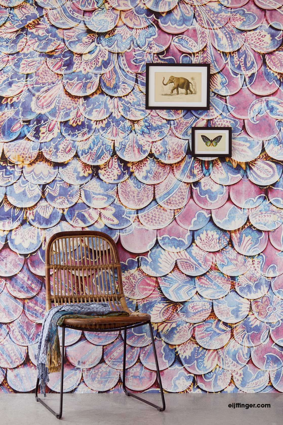 Die digital gedruckte Sundari Fototapete Scallop Wall Antique 375210 von Eijffinger verbindet Orientalische Ornamente mit einer ausgefallenen Schuppen Optik.