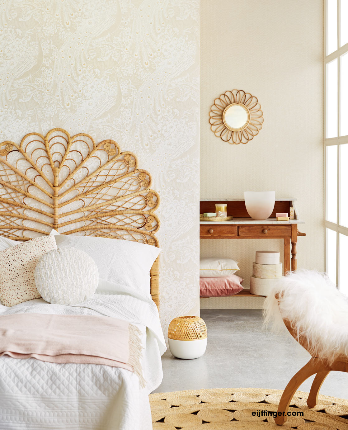 Die edle Reflect Tapete 378003 mit Pfau und Blumen Muster von Eijffinger ist eine sehr hochwertige Tapete und ein Blickfang in jedem Zuhause.