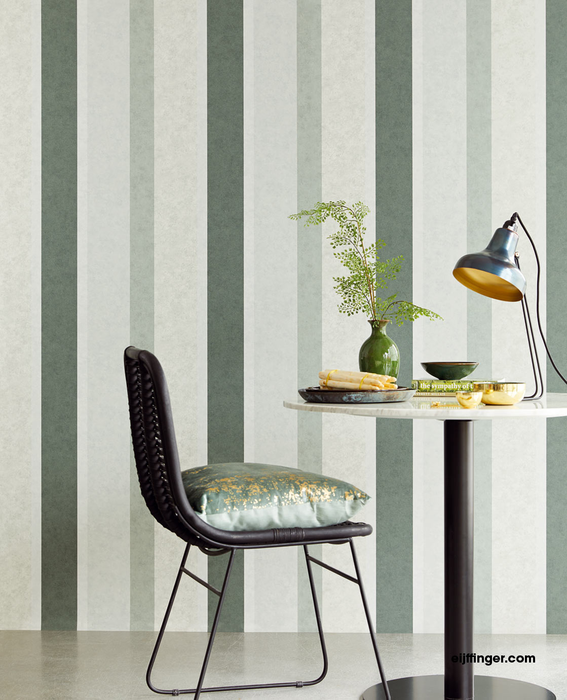 Die schlichte Stature Tapete 382553 mit grünem Streifen Muster von Eijffinger bietet sich perfekt an zum Kombinieren mit anderen Tapeten aus der Kollektion.