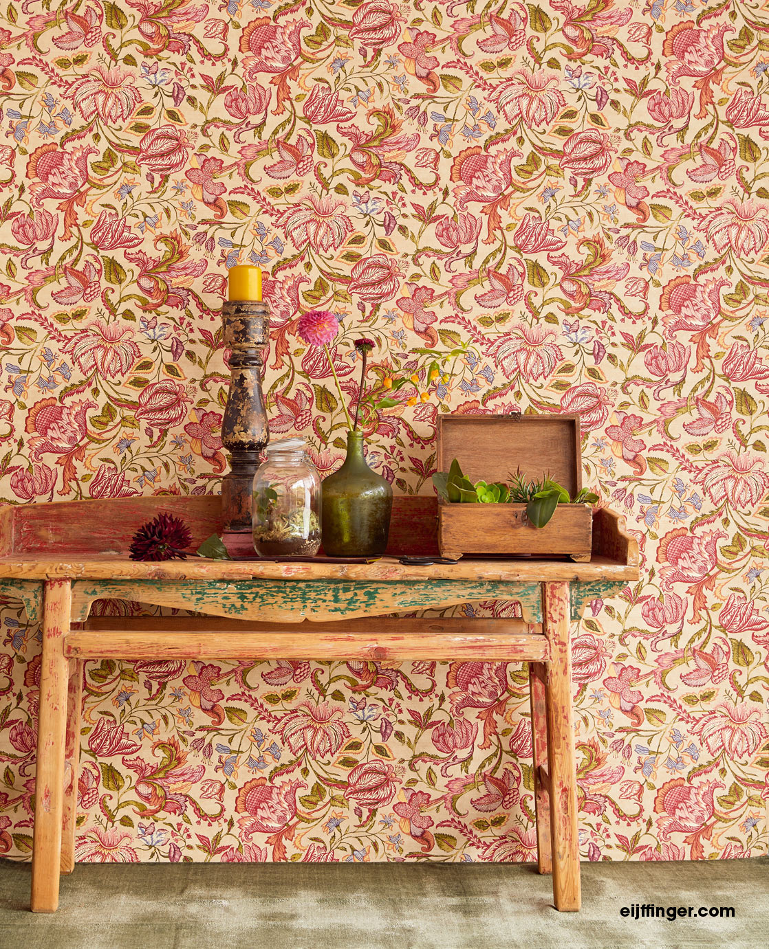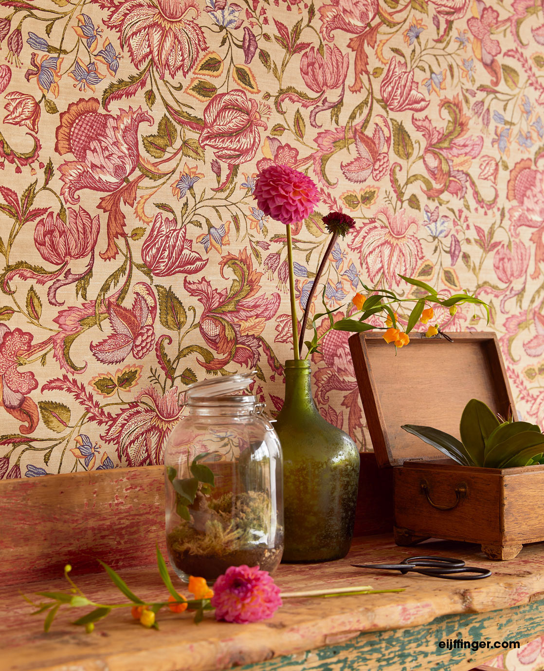 Die fremdländische Sundari Tapete 375102 mit exotischem Blumen Muster von Eijffinger bringt den Charme indischer Kunst zu Ihnen.