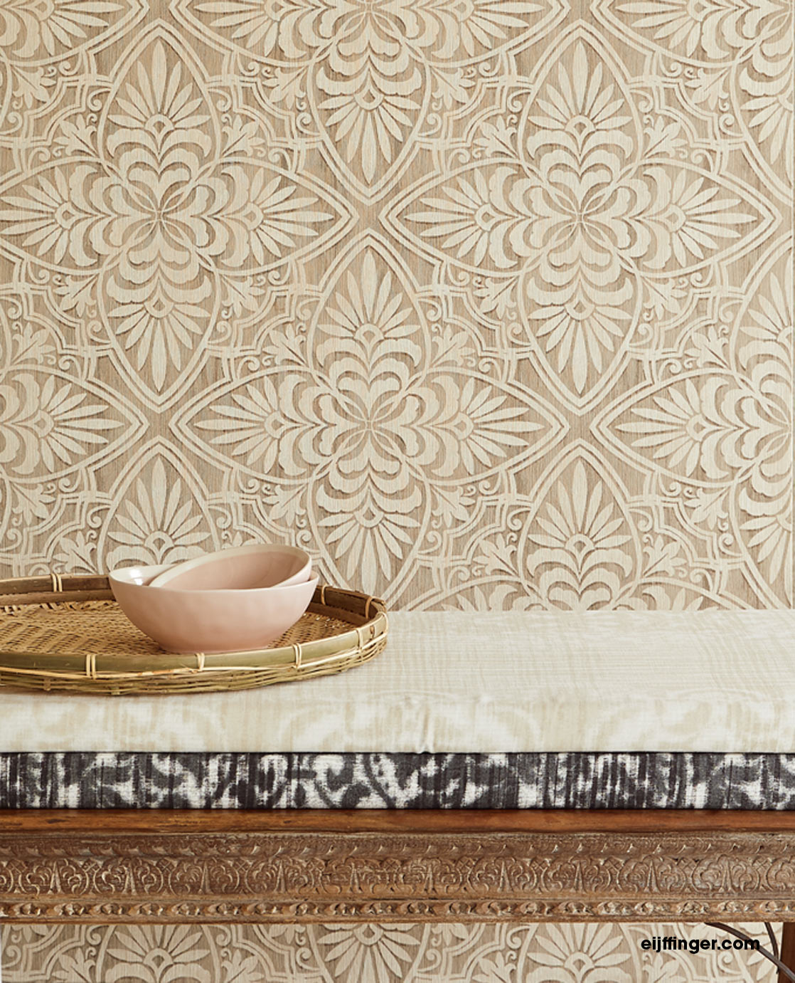 Die elegante Sundari Tapete 375131 mit Blumen Ornament von Eijffinger gibt Ihrem Zuhause einen Hingucker mit der Optik eines indischen Grasschnitts.