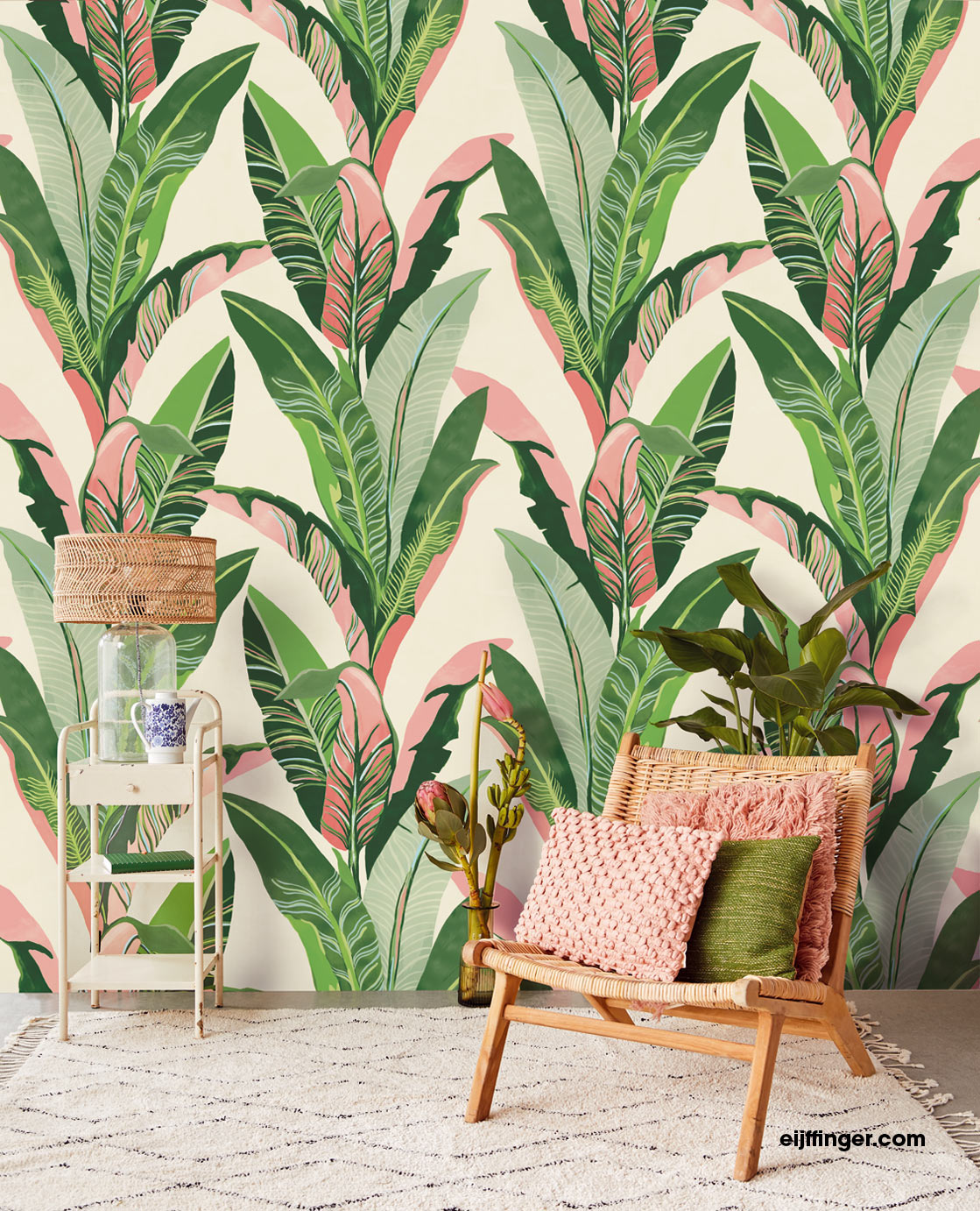 Das Wandpanel Miami Blush 384601 aus der Vivid Kollektion von Eijffinger mit seinem außergewöhnlichem Bananenblatt Motiv bringt eine tropische Stimmung in Ihr Zuhause und ist ein echter Hingucker jedem Raum.