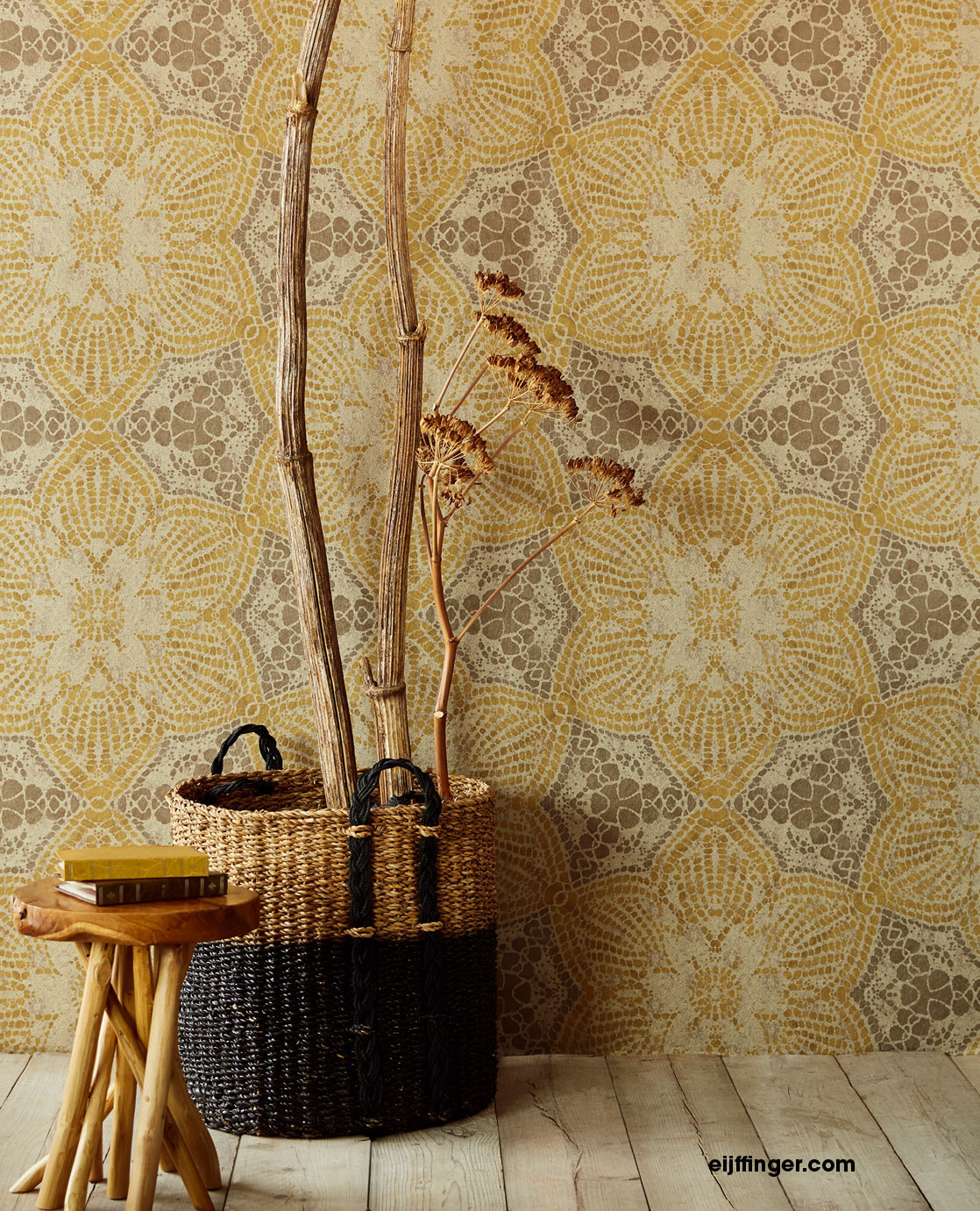 Das digital gedruckte Wandbild Boho Flower Ochre 376095 aus der Siroc Kollektion von Eijffinger trägt Sie davon ins ferne Indien.