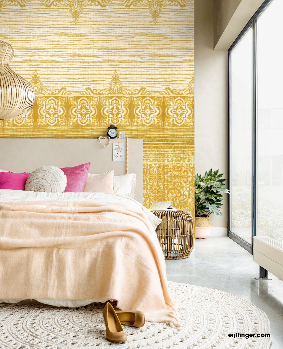 Das digital gedruckte Sundari Wandpanel Taj Ochre 375215 von Eijffinger lädt Sie ein auf eine Reise in den fernen Orient.