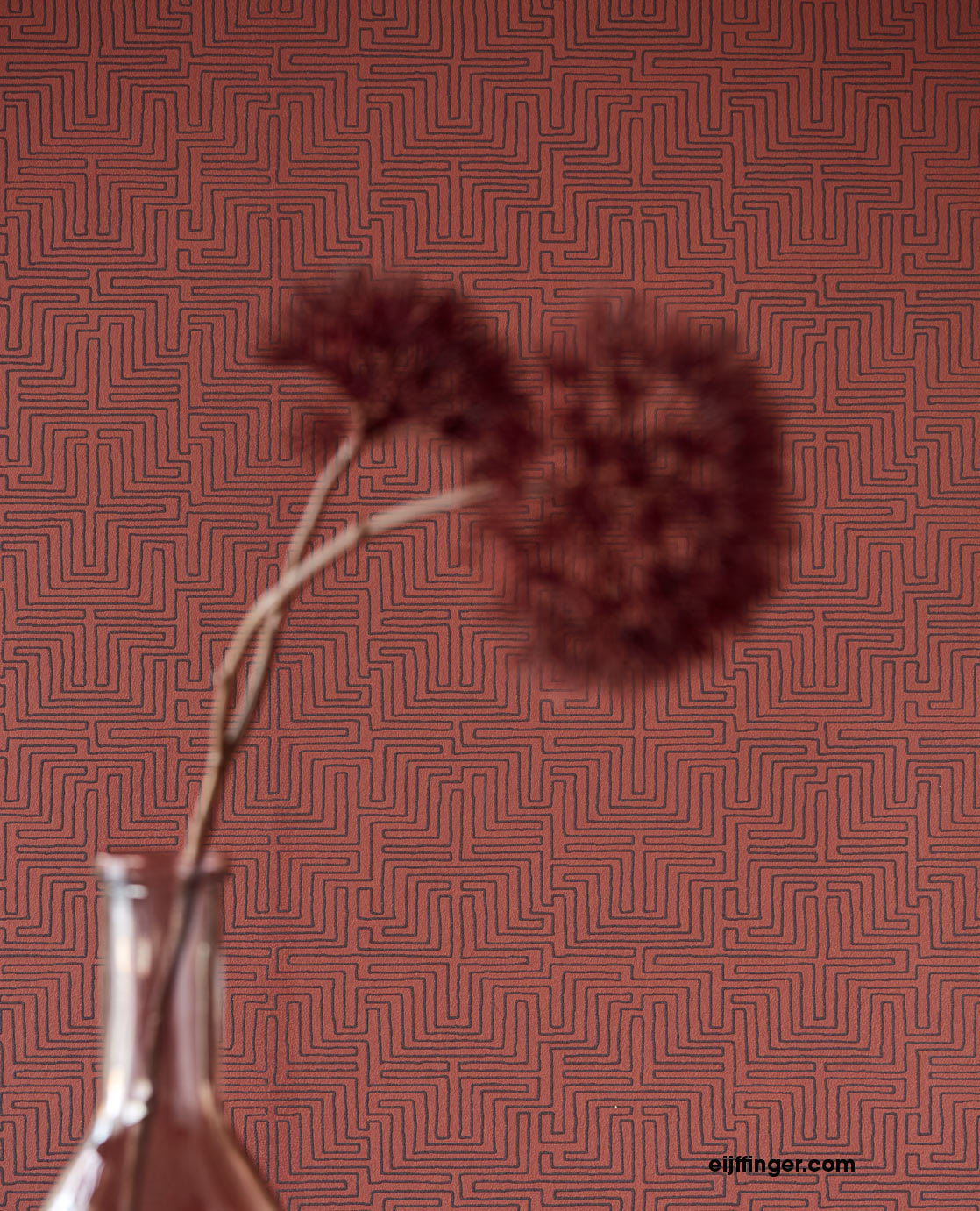 Die exotische Siroc Tapete 376061 mit roter Labyrinth Optik von Eijffinger bietet Ihnen eine gute Basis zum Kombinieren mit anderen Tapeten.