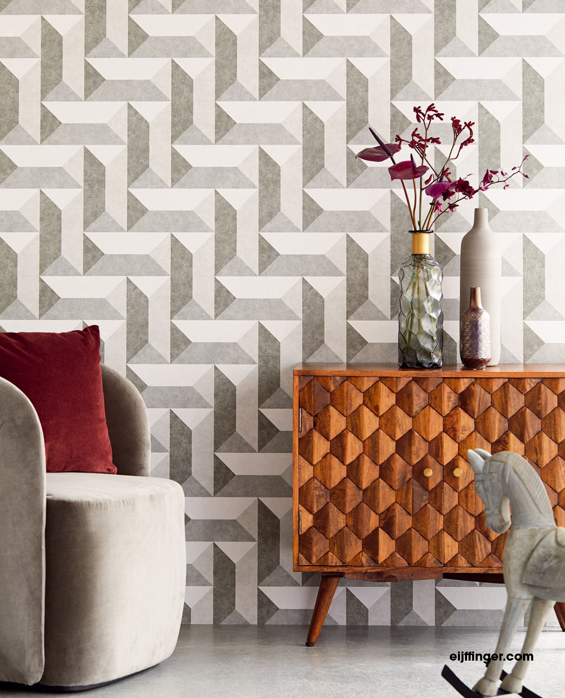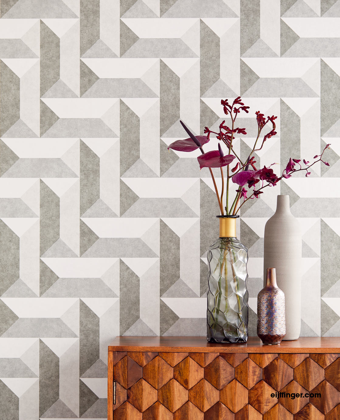 Die moderne Stature Tapete 382573 mit grauem 3D Fischgräten Muster von Eijffinger bietet vielfältige Einsatzmöglichkeiten.