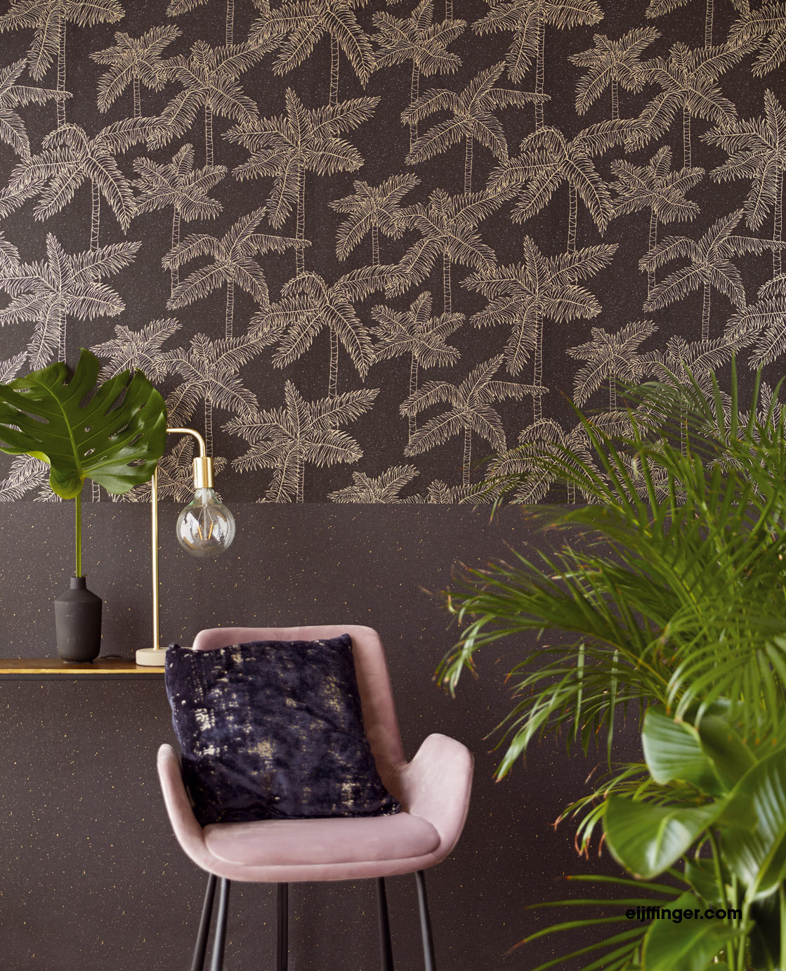Die edle Vivid Tapete 384515 von Eijffinger mit Palmen Motiv und metallic Effekt bringt ein wenig Natur in ihre Räume und lässt sich fabelhaft mit den anderen Vliestapeten aus der Kollektion kombinieren.
