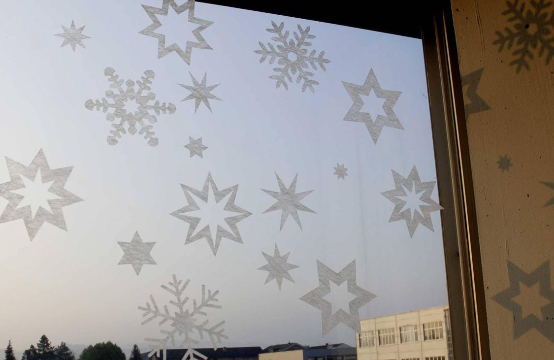 Unterschiedlich große, klassische Sternformen, kombiniert mit filigranen Schneekristallen, verleihen dem Fenster eine stilvolle, winterliche Stimmung und erlauben eine spannende und abwechslungsreiche Gestaltung.